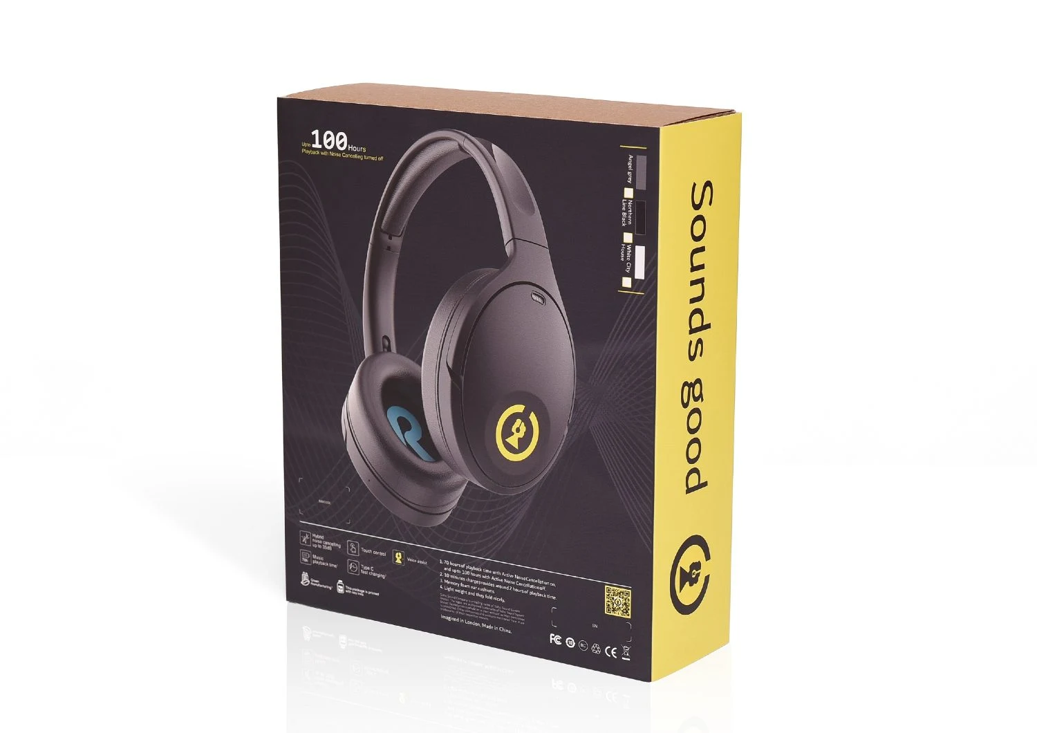 Hybrid noise cancelling headphone with 100h of battery life, black color