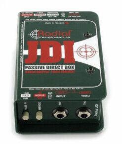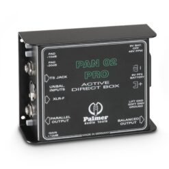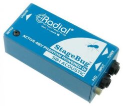 Active DI box in sturdy metal housing (aluminium/steel) with corner protectors, silver-blue/ metallic, internal 9 V battery (indicator blinks during operation) which is automatically switched off when phantom power is used (LED indicator is on continuously).Extremely low battery usage. Battery: 9 V block (not included).